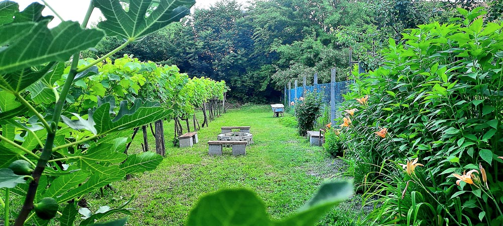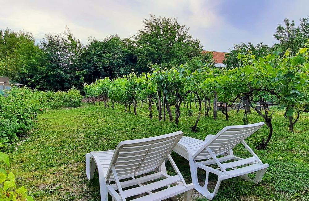 A hátsó kertben a grill terasz fa ülőgarnitúrával ellátott, ahol lehetőség van grillezésre a két faszenes grillen valamint bográcsozásra. A szőlőskertben korán érő szőlők, fügefa, málnabokrok, egres és szilvafák találhatóak illetve a füves tisztáson napágyak biztosítják a vendégek kényelmét.