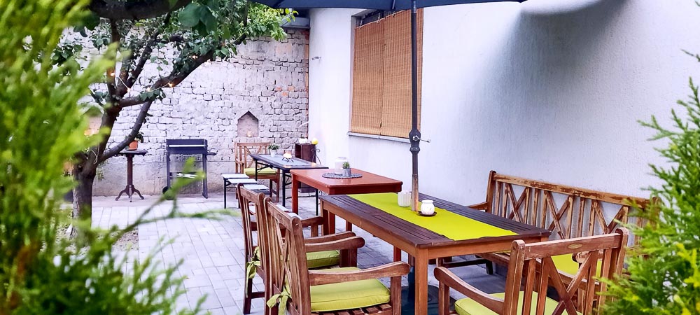 A vendégház egy hosszú udvaron fekszik, amelynek első részén épületek második felében pedig szőlőskert, grill terasz és bográcsozó található. Az udvaron több autó is kényelmesen tud parkolni.